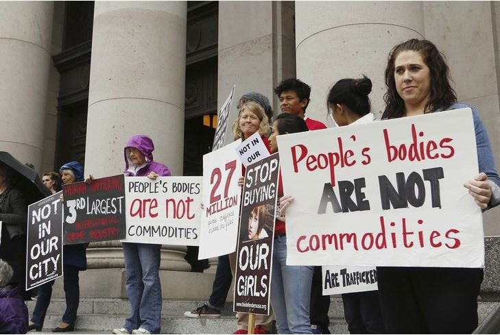 In this Oct. 21, 2014 file photo, people opposed to child sex trafficking rally outside of the Washington state Supreme Court in Olympia, Wash. (AP Photo/Rachel La Corte, File)